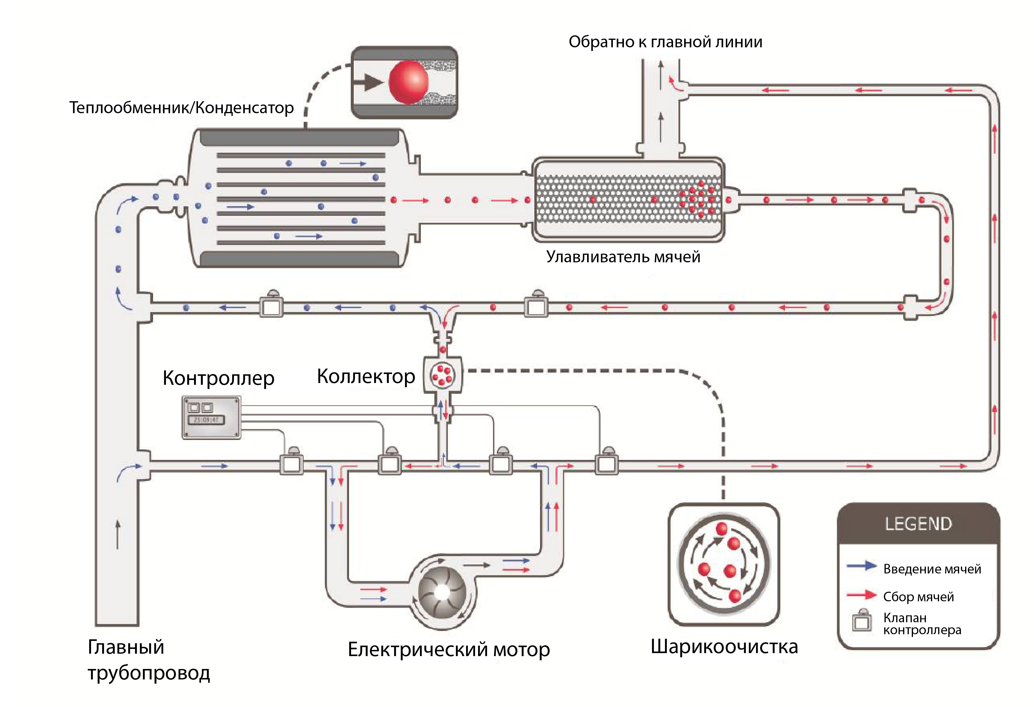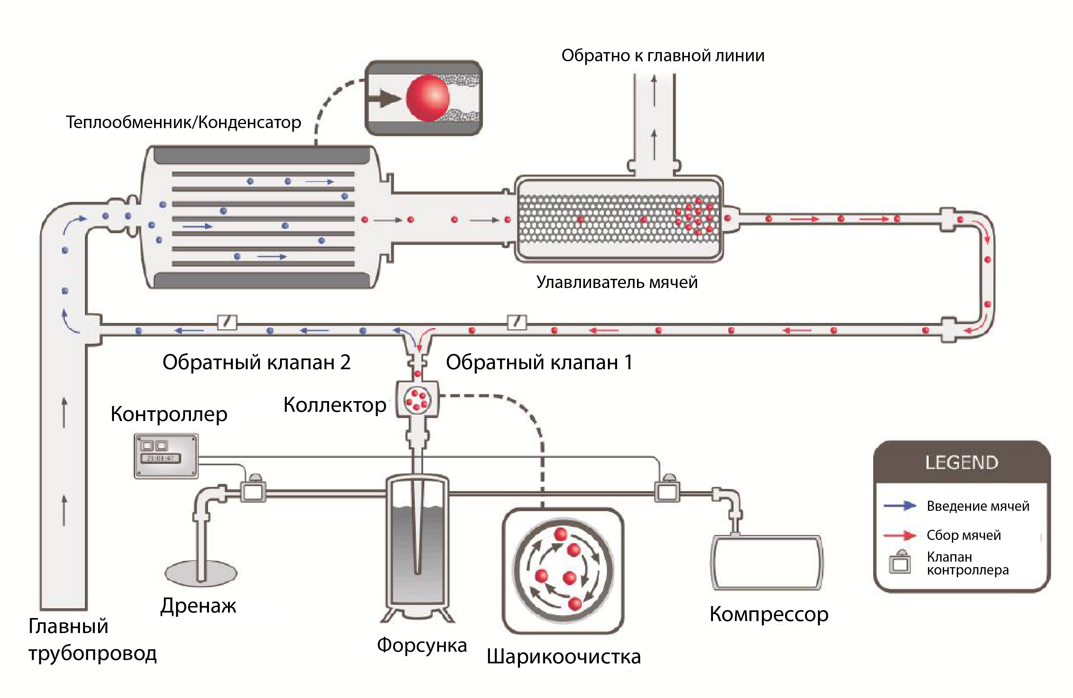 - Потім губчасті кульки захоплюються в так звану "ПАСТКУ" (Ball Trap) на виході з теплообмінника або конденсатора, де вони збираються для наступного циклу очищення.