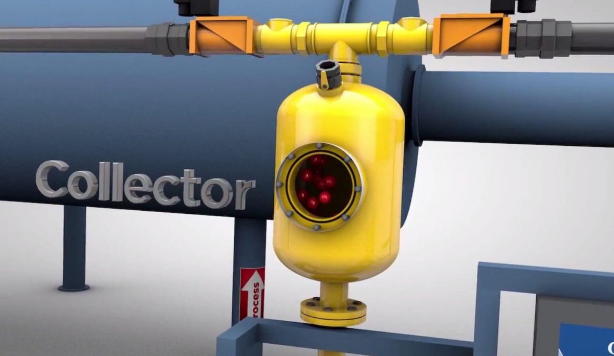 - Потім вони потрапляють в кульовий колектор, який утримує кулі між циклами очищення, де вони потім промиваються.