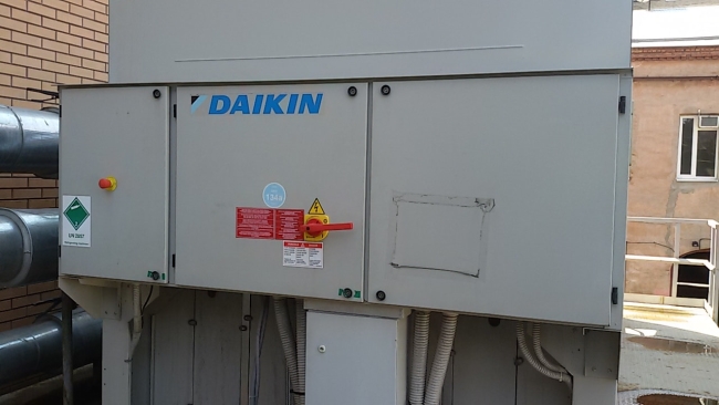 Сумарна продуктивність 1,8 МВт холоду. Холодильна машина з повітряним охолодженням та гвинтовим компресором.