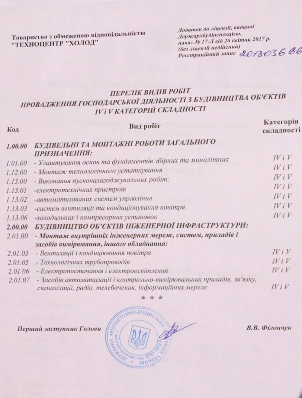 Лицензия Государственной Архитектурно-строительной инспекции Украины выдана на ведение хозяйственной деятельности по строительству объектов IV и V категорий сложности.